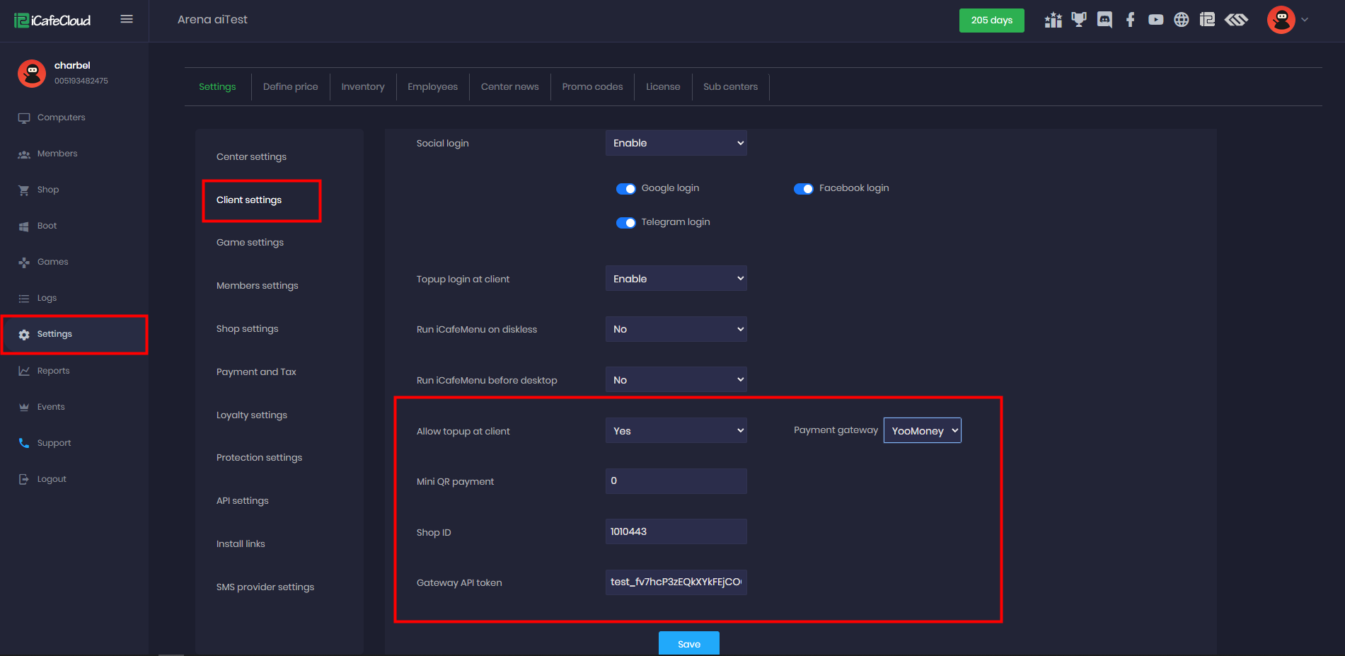 - In the iCafeCloud control panel, navigate to Settings > Client and enable the Allow top-up at client option. Then, fill in the Shop ID and Gateway API Token for YooMoney. (Figure 2)