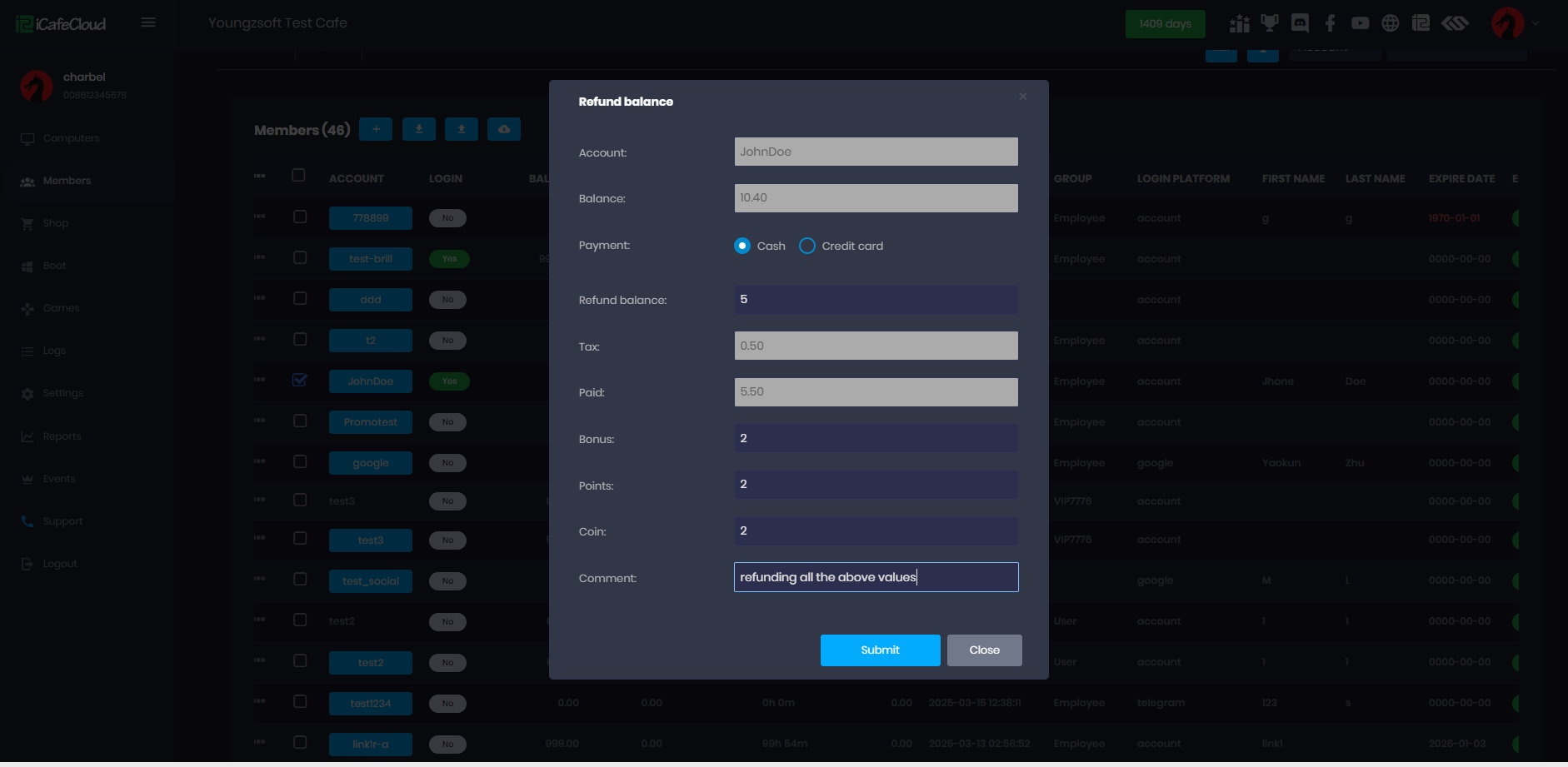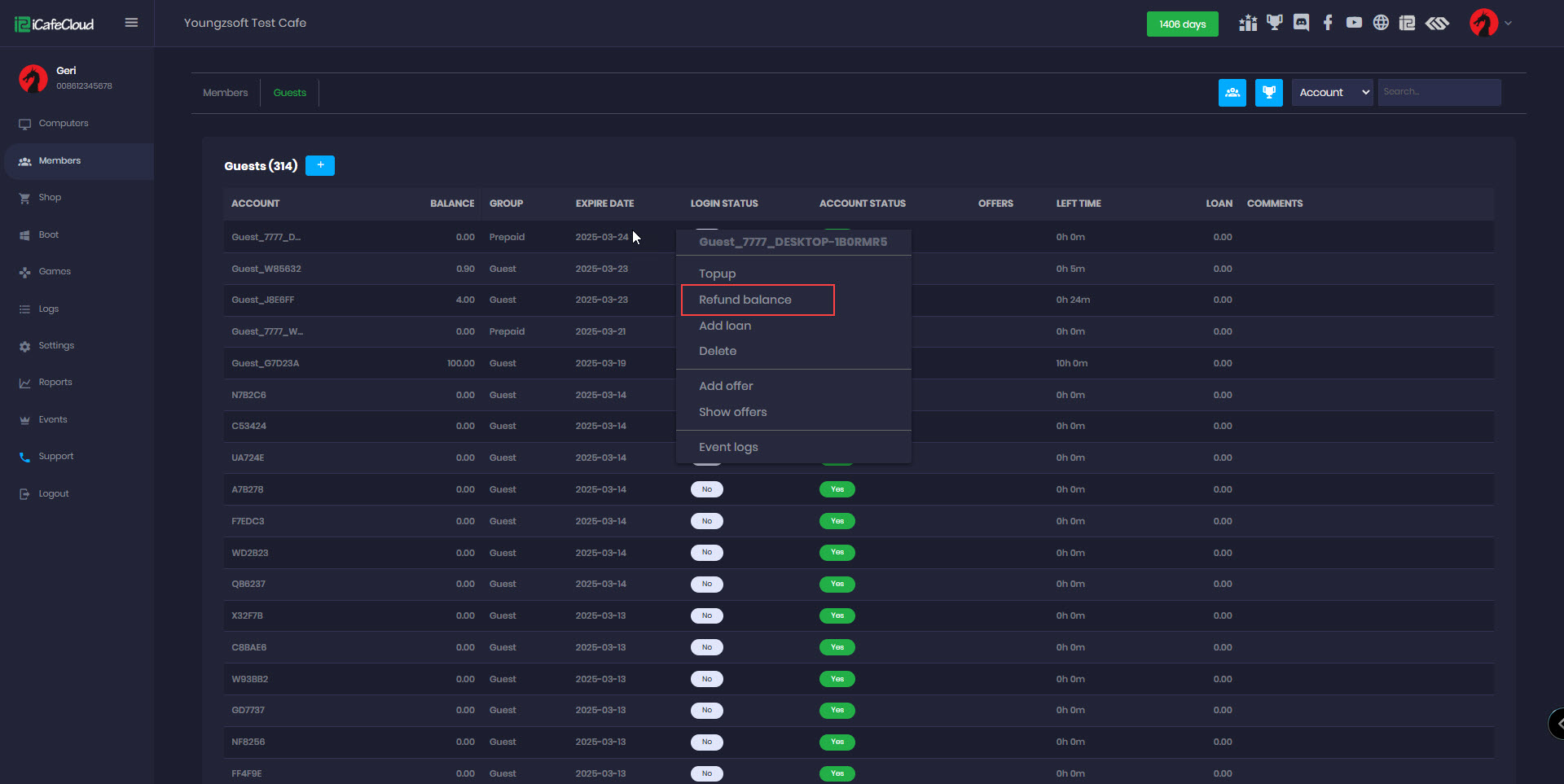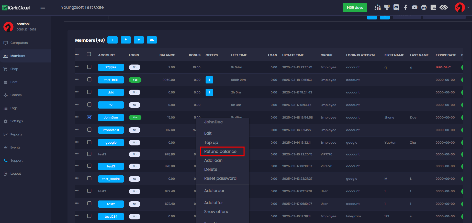 - You can reduce balance, points, bonuses, and coins by right-clicking on the member and selecting "Refund Balance." (Figure 1).