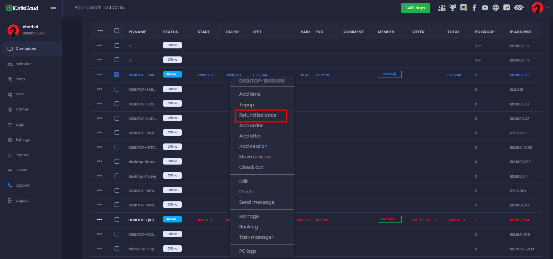 - When a member is logged in on a PC, a refund can be processed from the PCs page by right-clicking on the PC.(Figure 4).