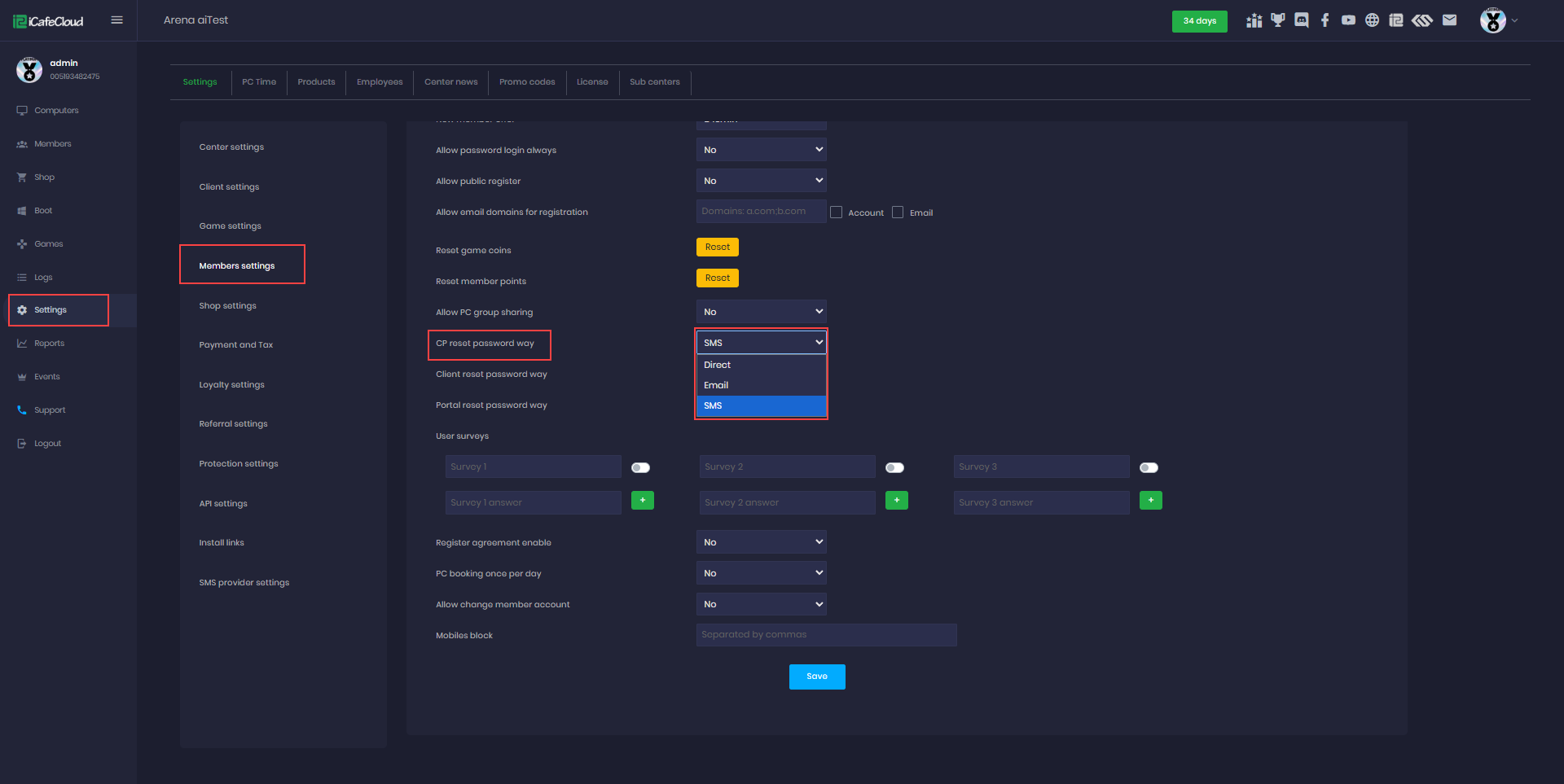 - Go to the Settings page, then navigate to Member Settings. Next to the "CP reset password way" option, you can choose between Direct Reset, Email Reset or SMS. (Figure 1)