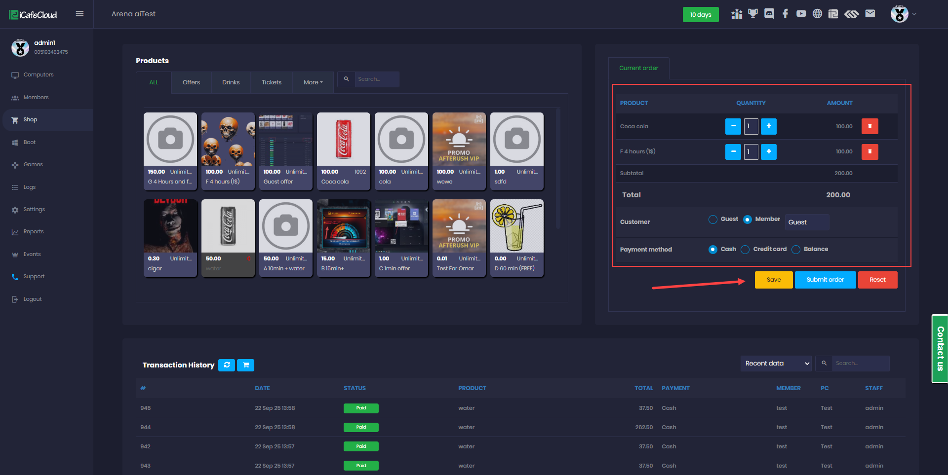 - Place an order by selecting the offer and products, choose a member or guest then payment method, and click Save(Figure 1)