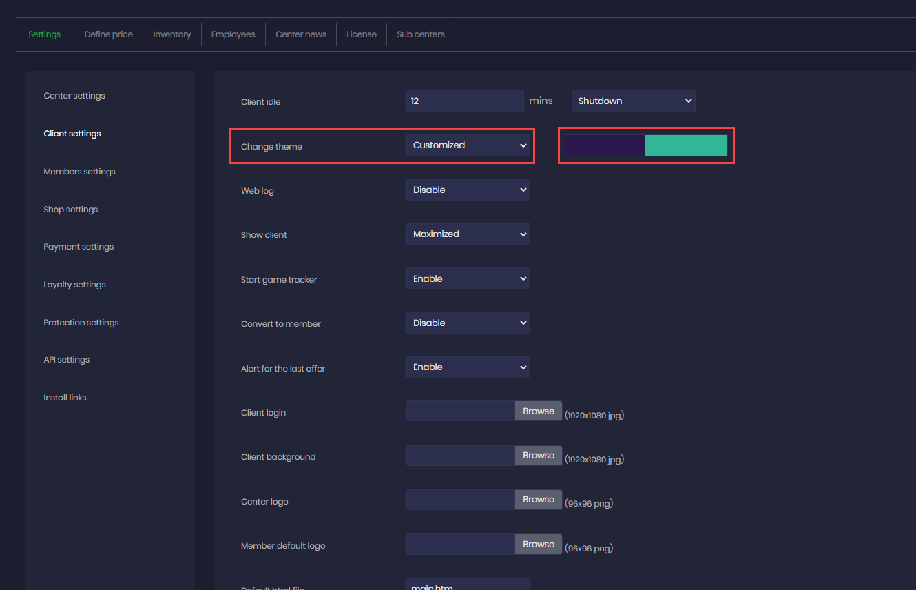 You may now change the color of client interface just by clicking on change theme and selecting preconfigured colors or by selecting your own customized color for the client interface (Figure 1)