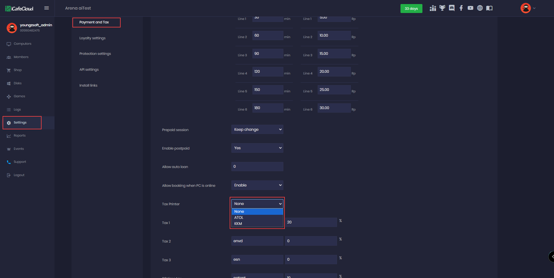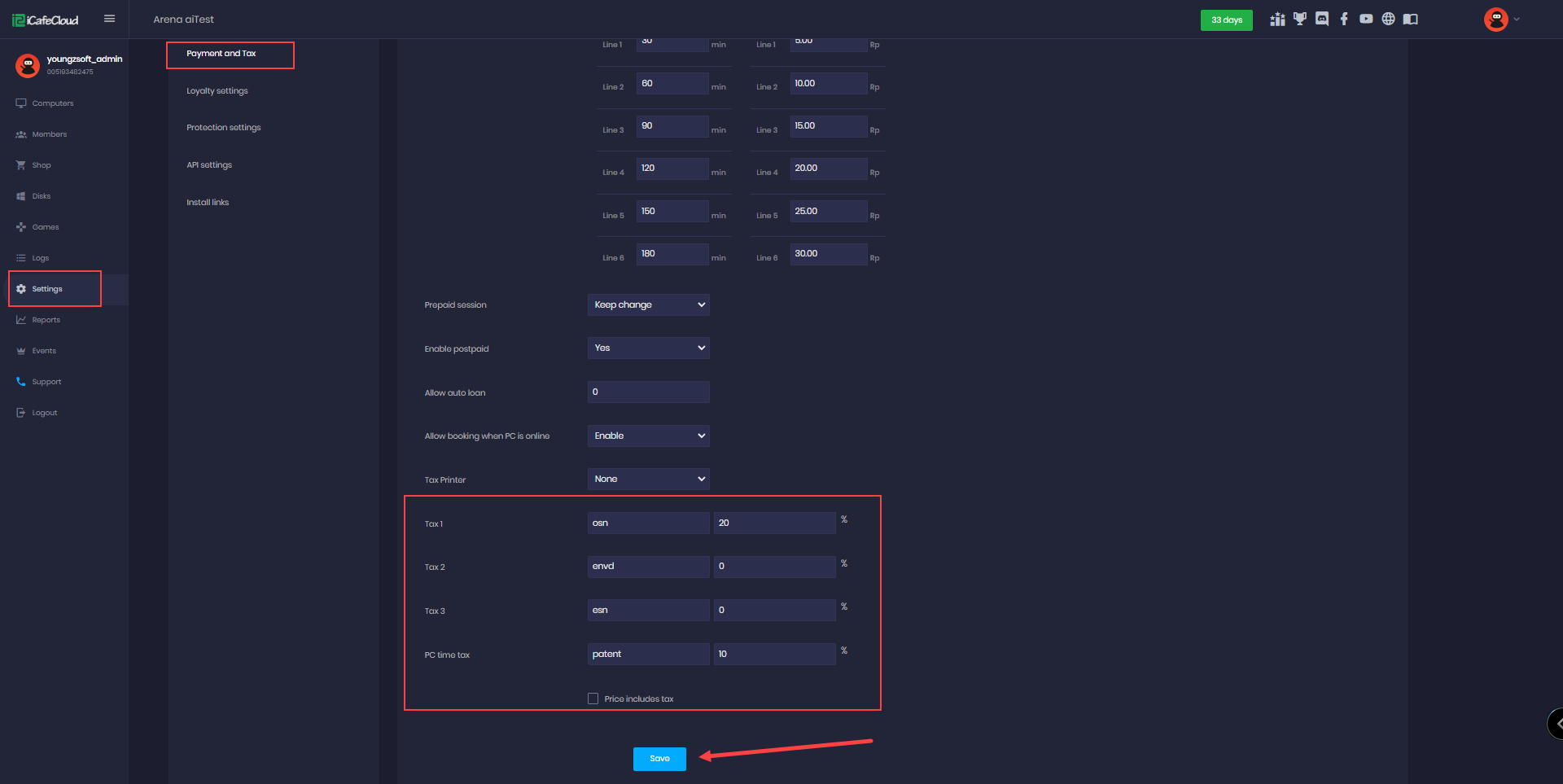 You can add up to three different tax plans. To begin, enter the name of each tax along with its corresponding percentage. If you wish to apply tax to PC time as well, specify the percentage for the "PC time tax." Additionally, check the box labeled "tax calculation included in price" if the product price already includes tax otherwise tax will be added separately. (Figure 2).