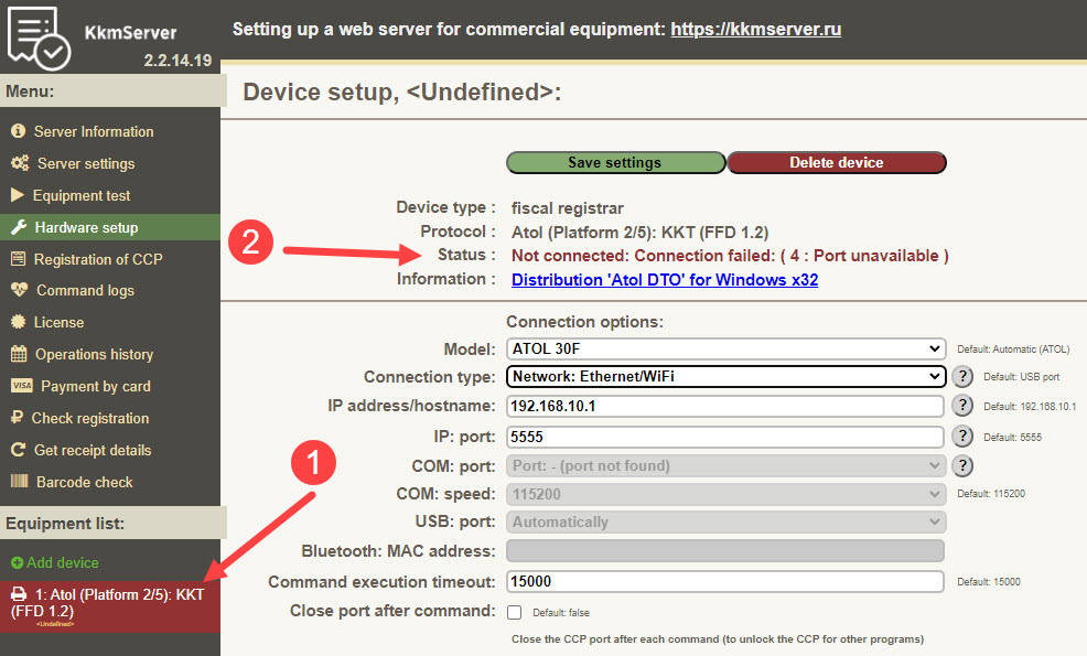 - Now, you will be able to see the hardware connected to the KkmServer in the “status”. If the connection is not successful, you can change the connection type based on your connection from the hardware to the KkmServer PC (Figure 4).