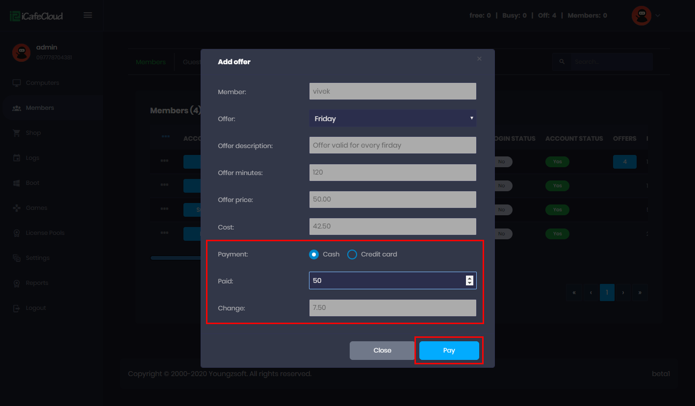 - iCafeCloud sends a print command to KKM for purchase from SHOP Cash and Credit card