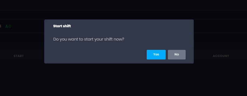 - Upon logging in with an employee account, a prompt will request to initiate a shift in order to proceed.