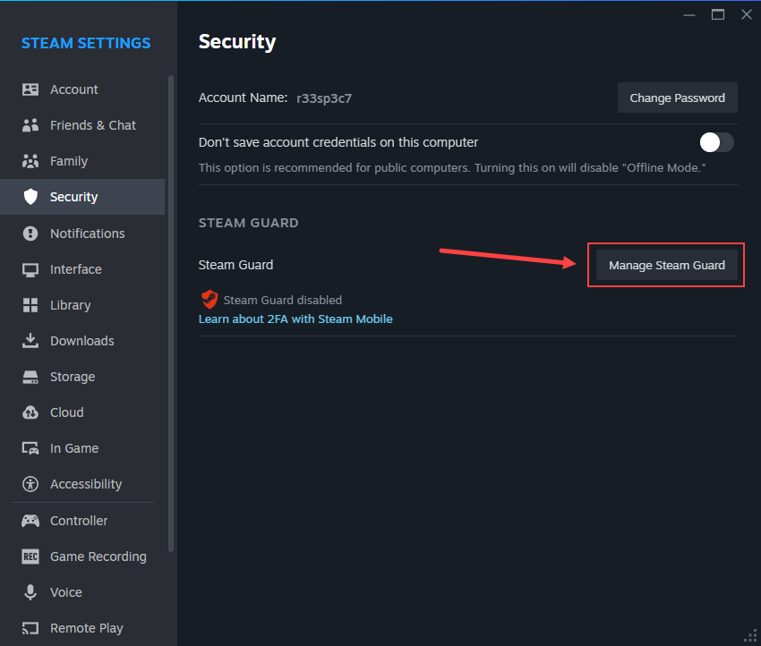 - Open steam.exe and log in with the account you will use for script updates. Then go to the Security page and click Manage Steam Guard. (Figure 4)