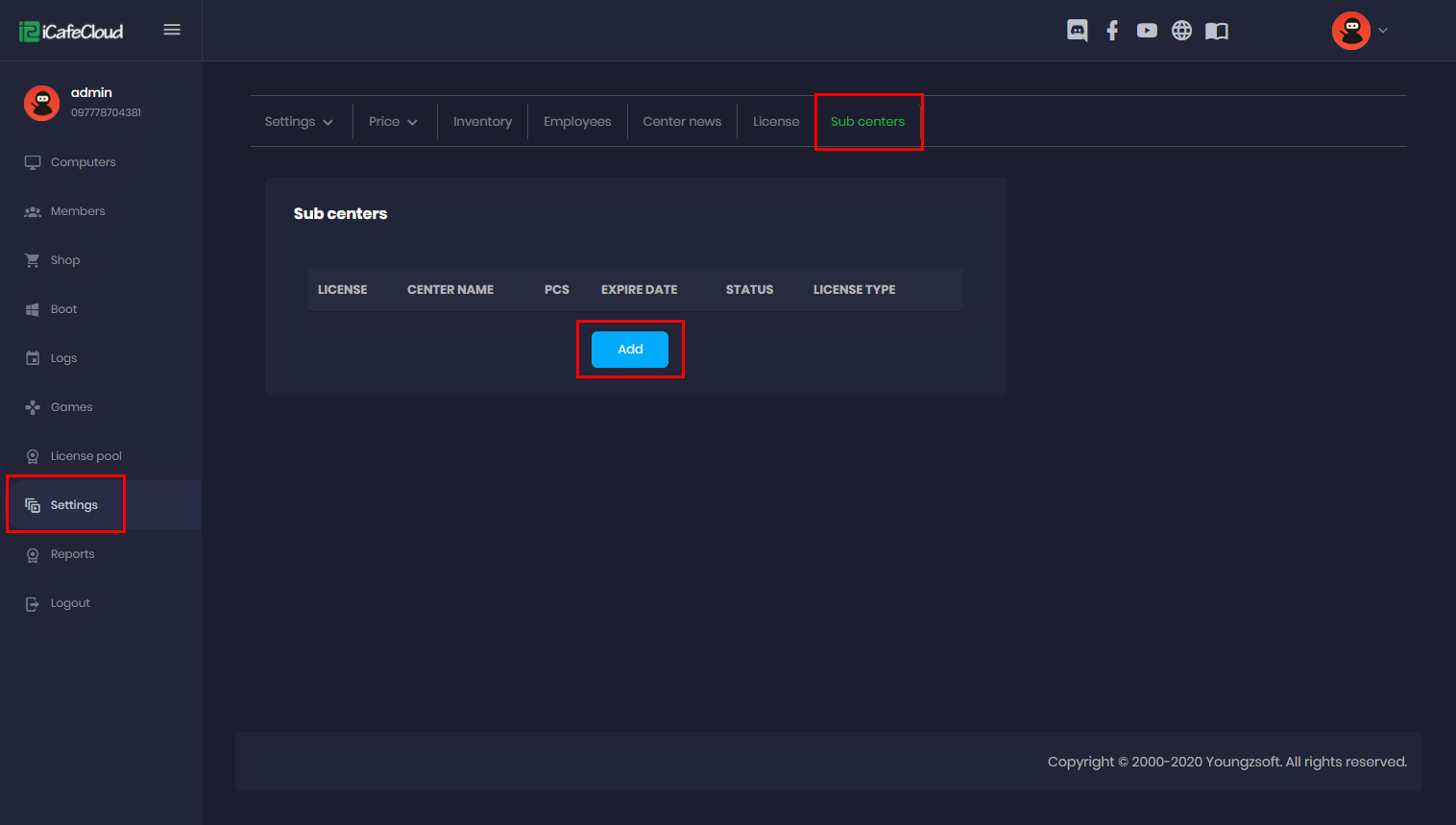 - Go to the settings page, click the “Sub centers” tab and click the “Add” button (Figure 1).