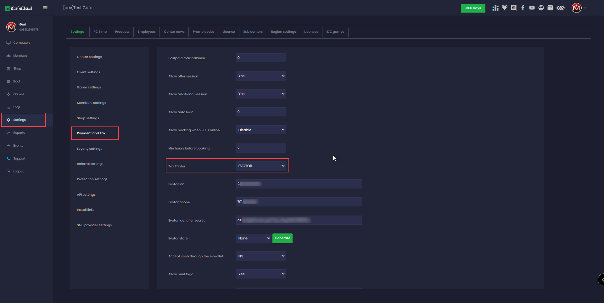 - Go to the Settings page, then to Payment & Tax, and under Tax Printer, select EVOTOR. (Figure 1)