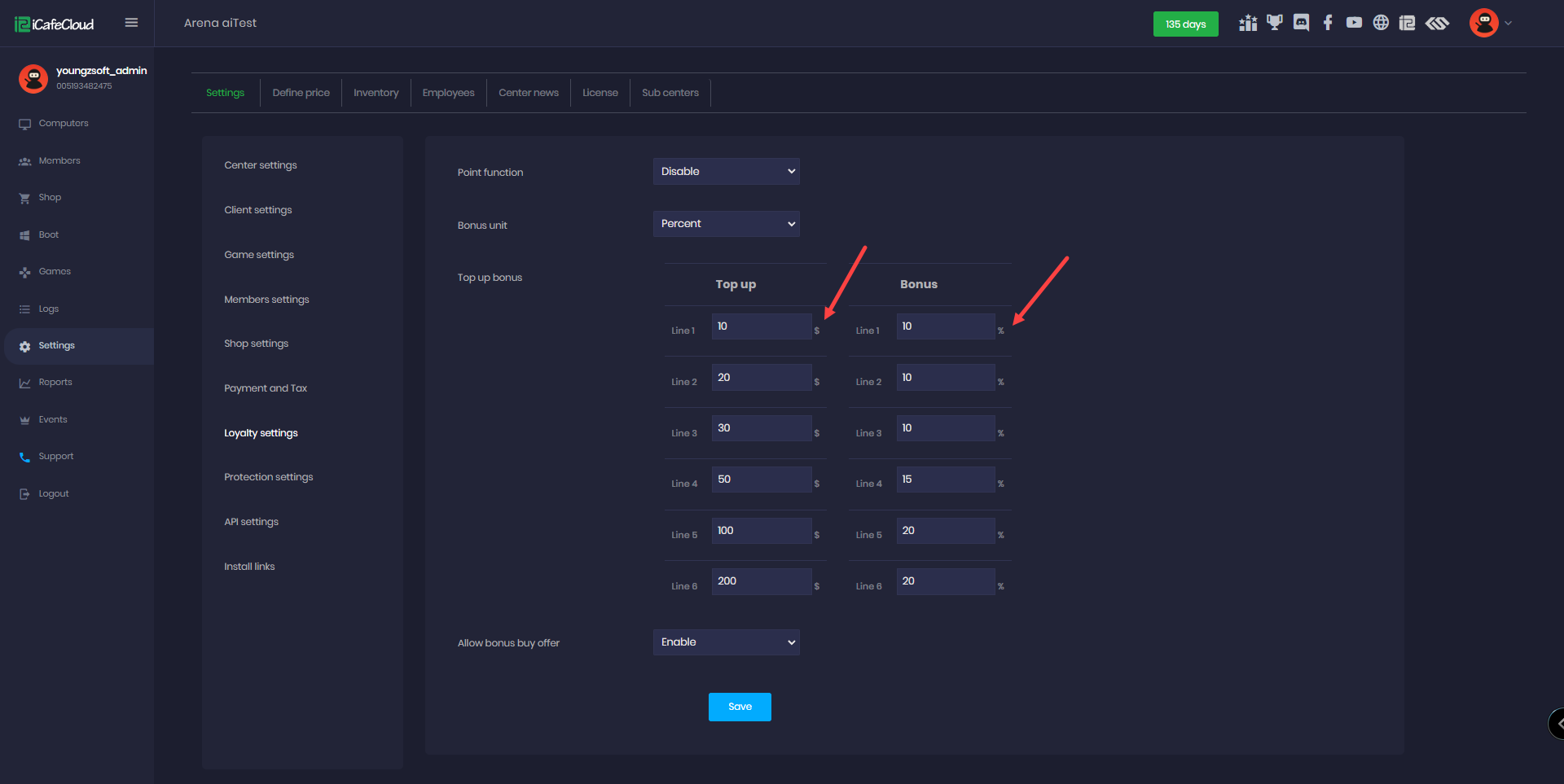 - Once the option is selected, you can edit the top-up and bonus settings. For instance, if you choose to set a percentage-based bonus, you can specify the percentage and click the save button. For example, by adding $10, it will automatically add 10%, resulting in a $1 bonus credited to the customer's account.(Figure 2).