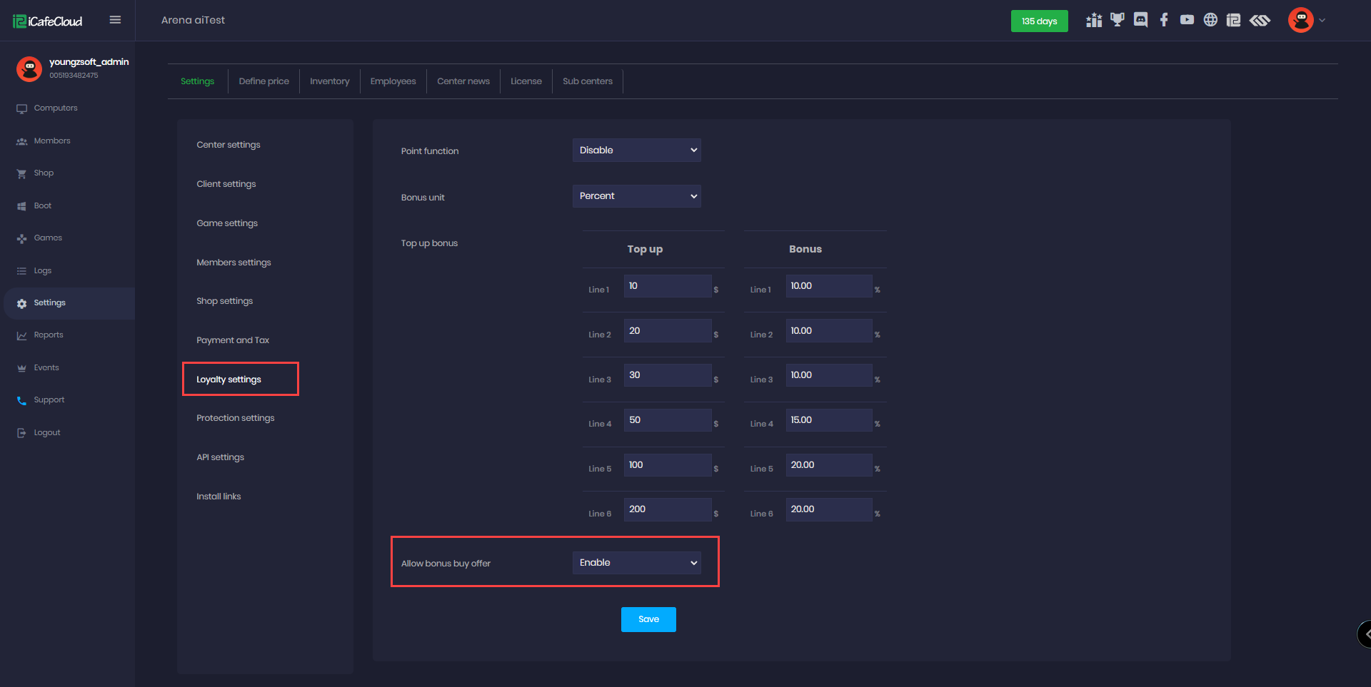 [percent. if L(n) <= topup < L(n+1), then bonus = topup x percent(n) / 100] - To activate one of the functions, navigate to "Settings," then "Loyalty Settings," and choose one of the available options.(Figure 1)