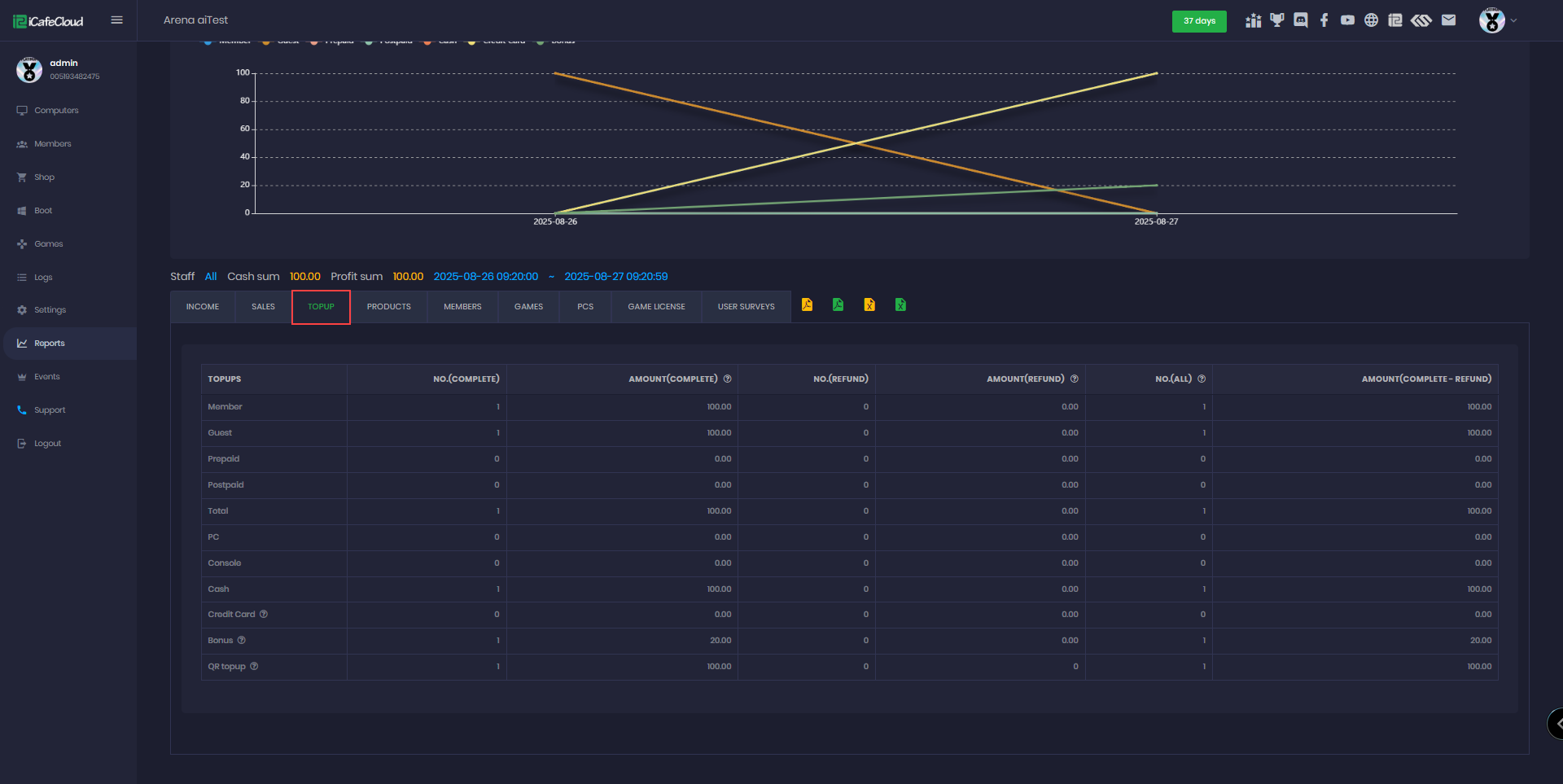 - Members Topup (showing detailed number of members account topped up + total amount topped up)