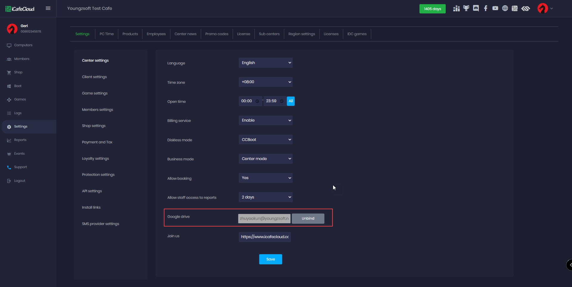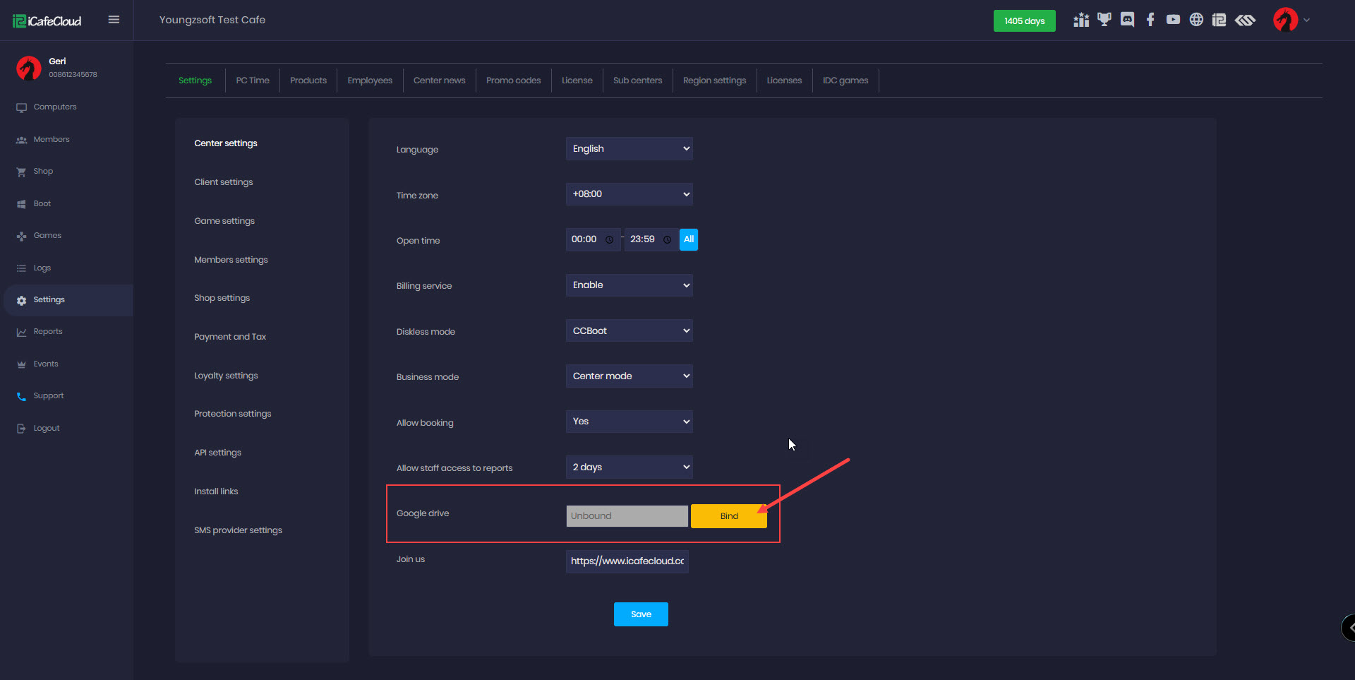 - For that you need to go to the center settings and bind your google drive to iCafeCloud.