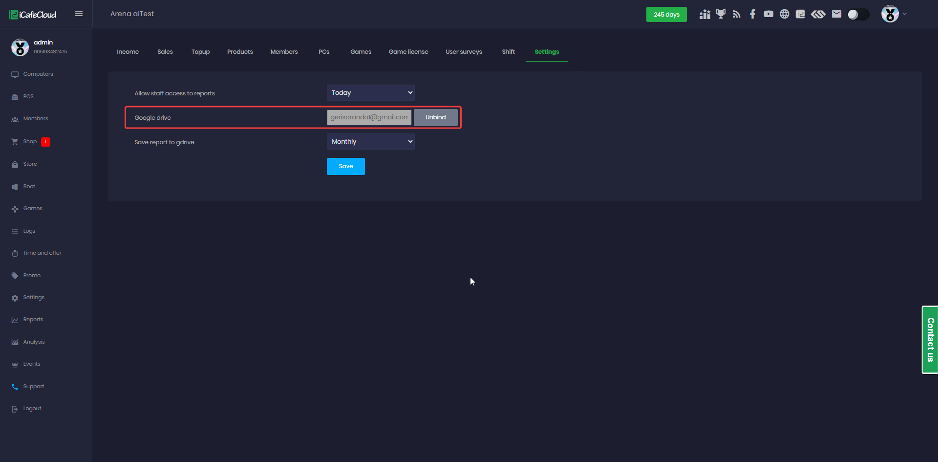 - For that you need to go to the Report page - settings and bind your google drive to iCafeCloud.
