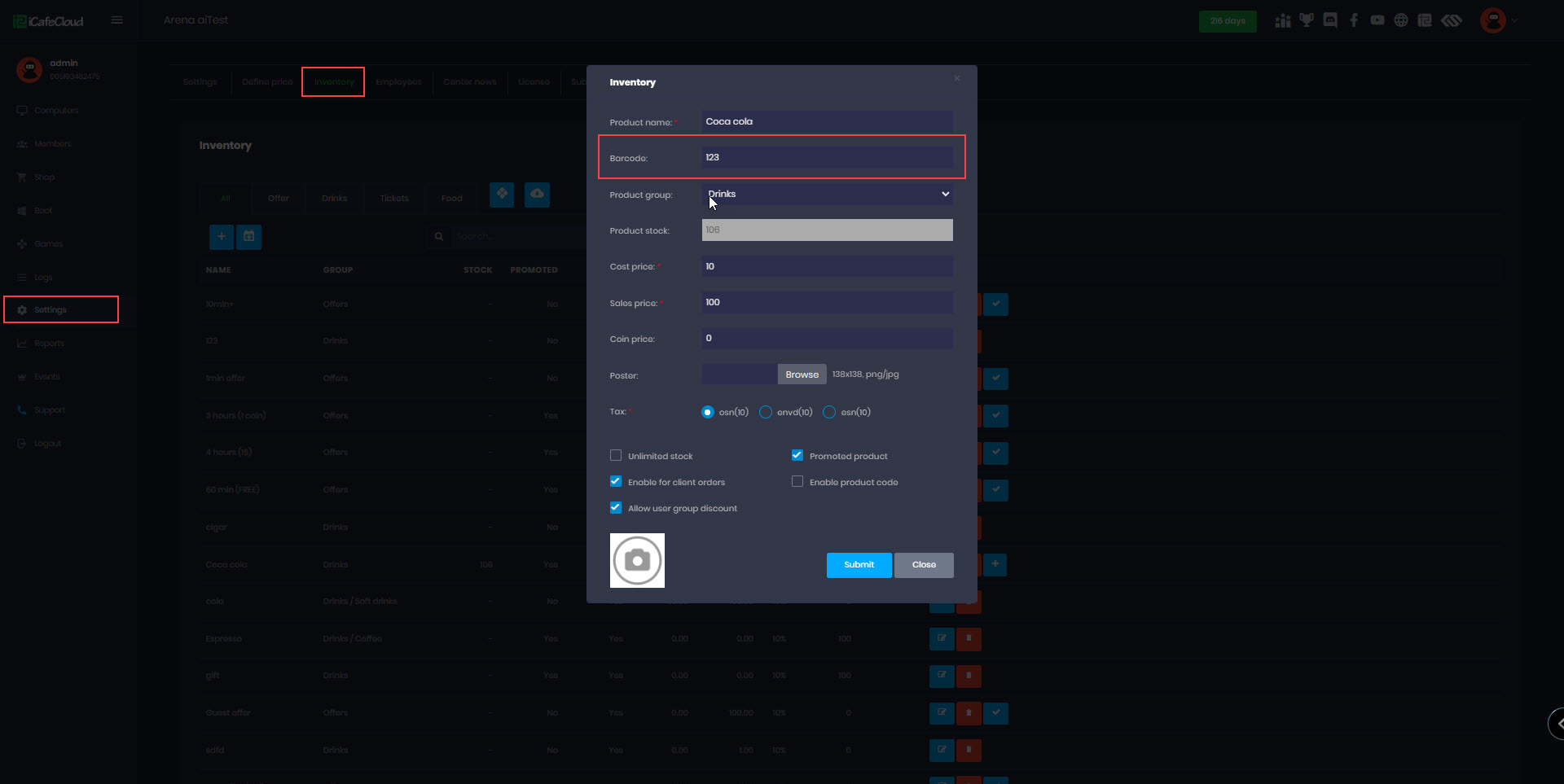 - Navigate to Settings > product, then select the Product or Offer you want to update or add a new Item. Click Edit, and in the product Configuration panel, locate the Barcode field. Enter the barcode number you want to assign to this item.(Figure 1)