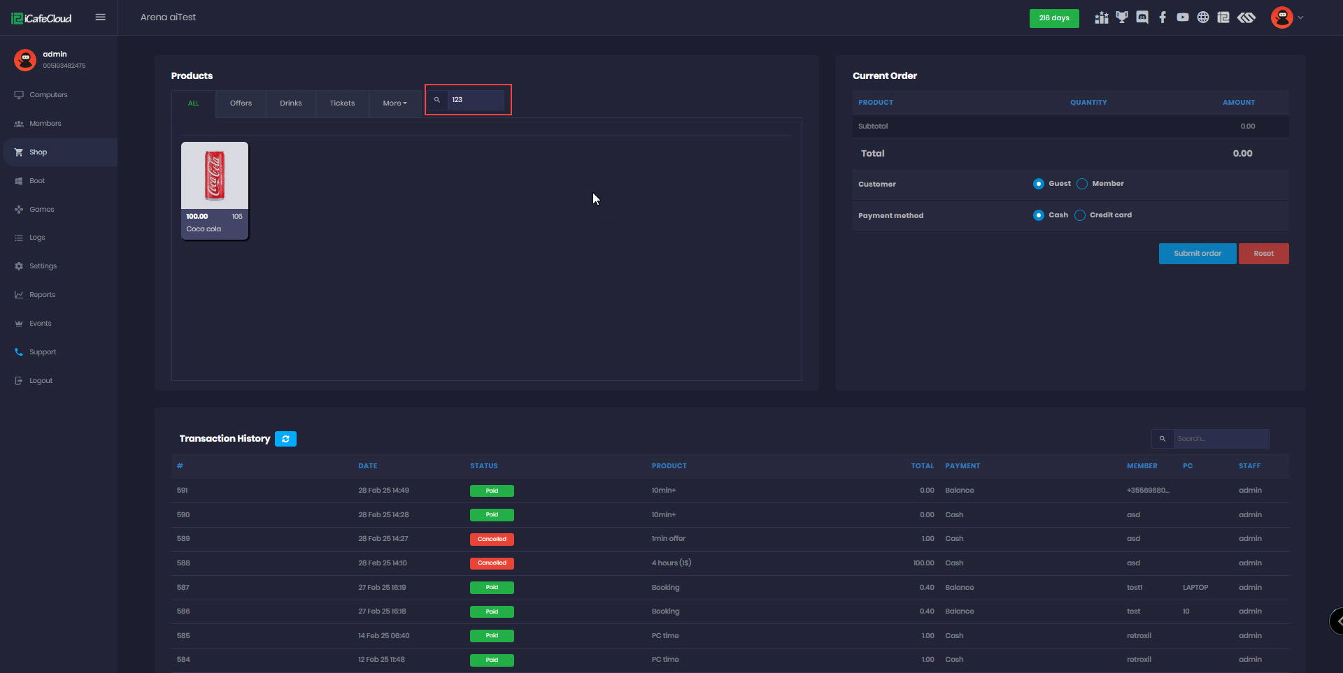 - Next, navigate to the Shop page and scan the item (e.g., Coca-Cola) using your barcode scanner. If the scanned number matches a barcode in the system, it will automatically search for the item and display it in the Shop list. (Figure 2)