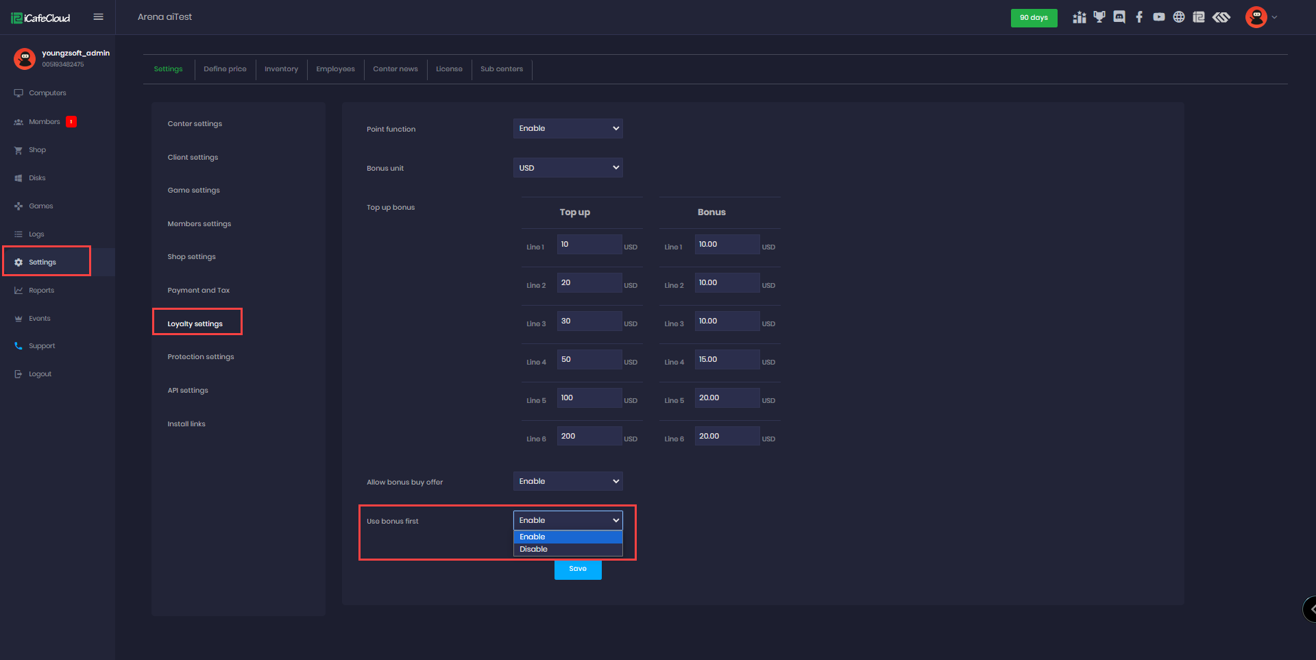 - Navigate to the Settings, then to the Loyalty Settings. Under "Use Bonus First," select either "Enabled" or "Disabled."(Figure 1)