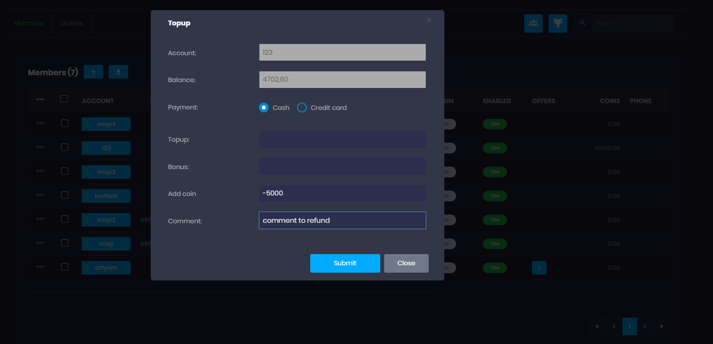 - You can add/refund user coins, on figure example to refund (Figure 4).