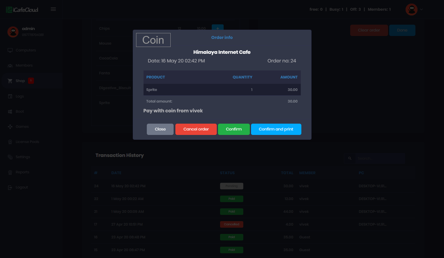 - On the CP, the order placed using the coin will be displayed as “pending” on the transaction history section (Figure 2).